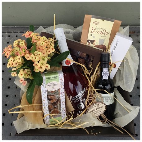 Romantisk Julebuket i røde nuancer med gran (Tæt)